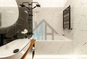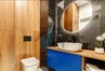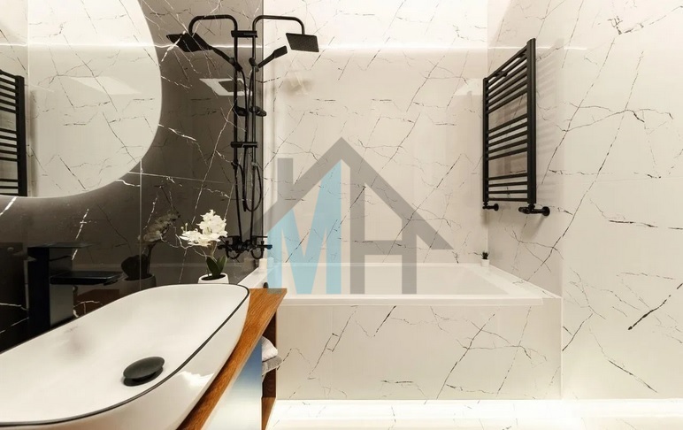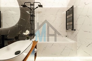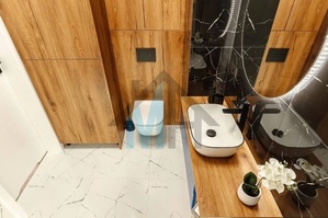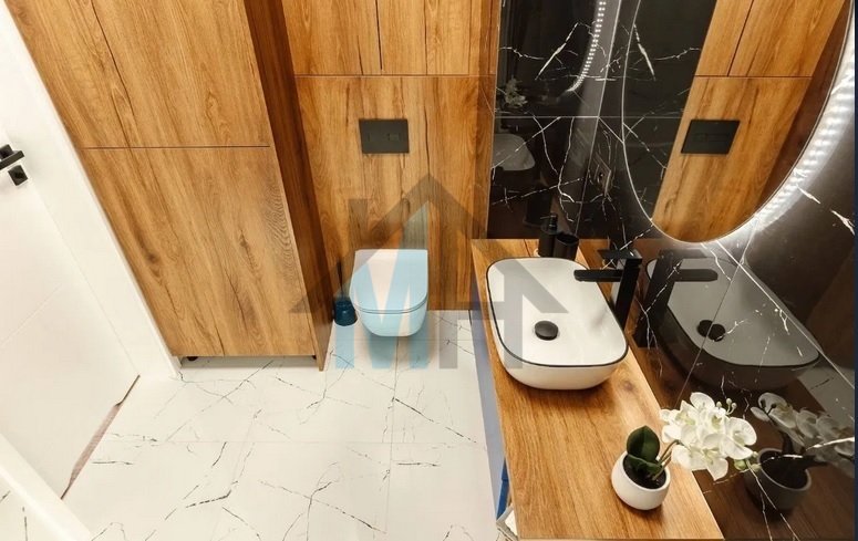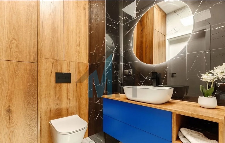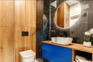 Łazienka jest urządzona w eleganckim i luksusowym stylu. Ciemne, marmurowe płytki na ścianach z widocznymi żyłkami nadają wnętrzu głębi i wyrafinowania. Przeciwwagą dla ciemnych powierzchni jest jasna podłoga wykończona marmurem, co równoważy całą przestrzeń. Centralnym punktem łazienki jest okrągłe lustro z podświetleniem LED, umieszczone nad umywalką nablatową, ustawioną na drewnianym blacie. Szafka pod umywalką, o nowoczesnym designie, jest biała z dodatkami drewna, co ociepla przestrzeń. Czarne elementy, takie jak armatura czy ramy drzwi prysznicowych, dodają wnętrzu nowoczesności i elegancji.