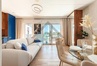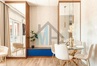 Salon jest przestronny i jasny, z dużymi oknami wpuszczającymi mnóstwo naturalnego światła. Wnętrze utrzymane jest w stonowanych, jasnych barwach z akcentami czerni, które nadają mu nowoczesny charakter. Ściany są zdobione ciemną tapetą z eleganckim, barokowym wzorem, co dodaje przestrzeni głębi i luksusu. Złote zasłony w oknach stanowią ciepły, kontrastujący akcent. Meble, takie jak tapicerowane krzesła i sofa w jasnych kolorach, tworzą komfortową przestrzeń do wypoczynku. Nad stołem jadalnianym, przy którym ustawione są designerskie krzesła, wiszą nowoczesne lampy, podkreślające elegancję wnętrza.