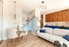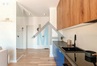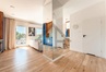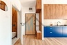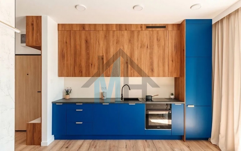 Kuchnia jest nowoczesna i minimalistyczna, z jasnymi, białymi szafkami i drewnianym blatem, który ociepla całość. Przestrzeń kuchenna jest dobrze zorganizowana, z dużą ilością miejsca do przechowywania, co sprawia, że jest zarówno estetyczna, jak i funkcjonalna. Drewno jest dominującym materiałem, który pojawia się również w elementach wykończeniowych, takich jak obudowa drzwi wejściowych czy schodów, co tworzy spójny i harmonijny wystrój.