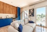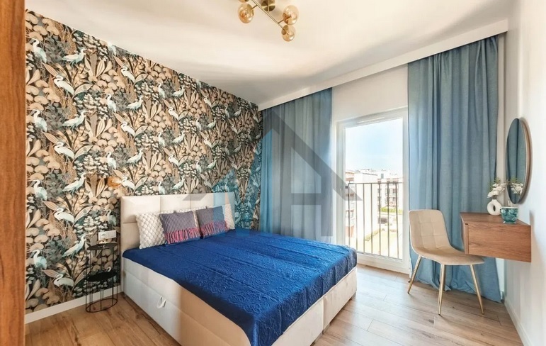 Sypialnia jest przytulna i elegancka, z dominującymi jasnymi kolorami i delikatnymi, ciepłymi akcentami. Łóżko z tapicerowanym zagłówkiem w jasnym beżowym kolorze jest centralnym elementem pokoju. Ciepłe, drewniane podłogi harmonizują z tapetą o subtelnym, klasycznym wzorze, co nadaje przestrzeni spokojnego, relaksującego charakteru. Duże okno z wyjściem na balkon wpuszcza naturalne światło, podkreślając przestronność pokoju. Przy łóżku znajdują się nowoczesne szafki nocne z drewna i białych frontów, które idealnie komponują się z resztą wnętrza.